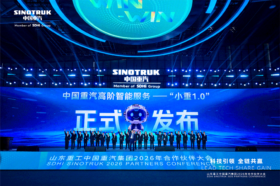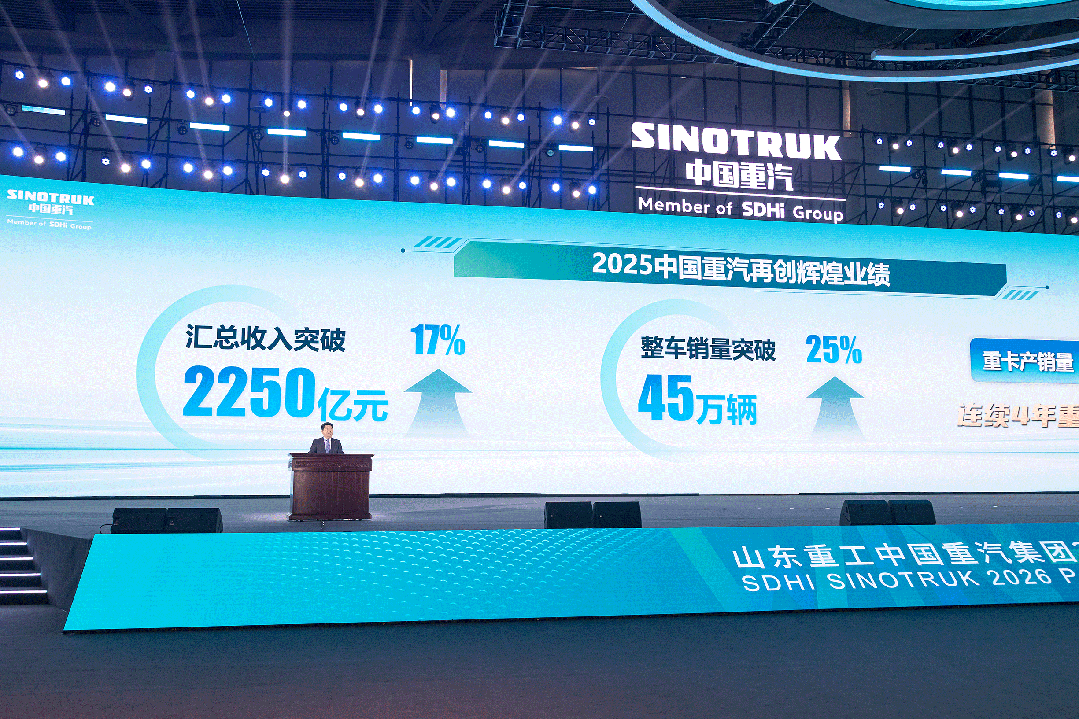 ??展望2026年,中国重汽将与各位合作伙伴共担目标、共拓市场、共享成果,携手实现产品、渠道、政策、品牌、服务、生态等全链条共赢,全力冲击国内整车销售34万辆目标,以更加紧密、更富韧性的“命运共同体”,为奋战“十五五”新征程筑牢坚实根基,为中国重汽跨越百年、全速迈向世界一流凝聚合力,共同开创中国商用车行业高质量发展更加美好的未来!
